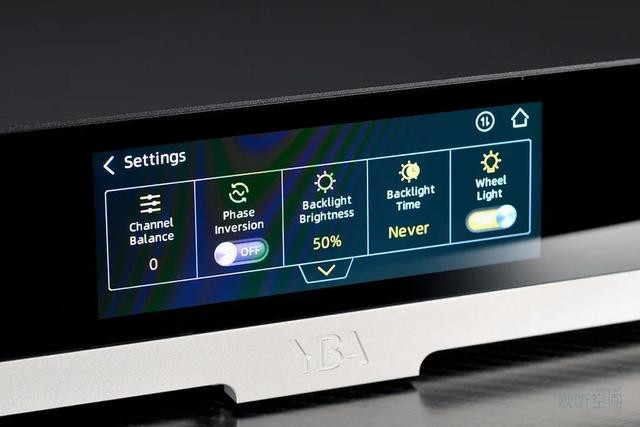 YBA其他系列产品的正面中央都有着树叶型黑白双色亚克力小窗用来点缀和显示电源灯。DESIGN系列的正面都是大尺寸屏幕,然而YBA将招牌设计放到了机器的开机画面中,继续传承着品牌的传统——不过YP302开机速度太快了,这个画面只闪过一瞬间(笑)。开机后用户可以通过触摸屏或遥控器对机器进行设置,如声道平衡、屏幕亮度等。触摸屏灵敏度高响应快,界面设计简洁美观,触碰区域大不会有误操作,还有三种界面色彩主题可选,是无可挑剔的部分。